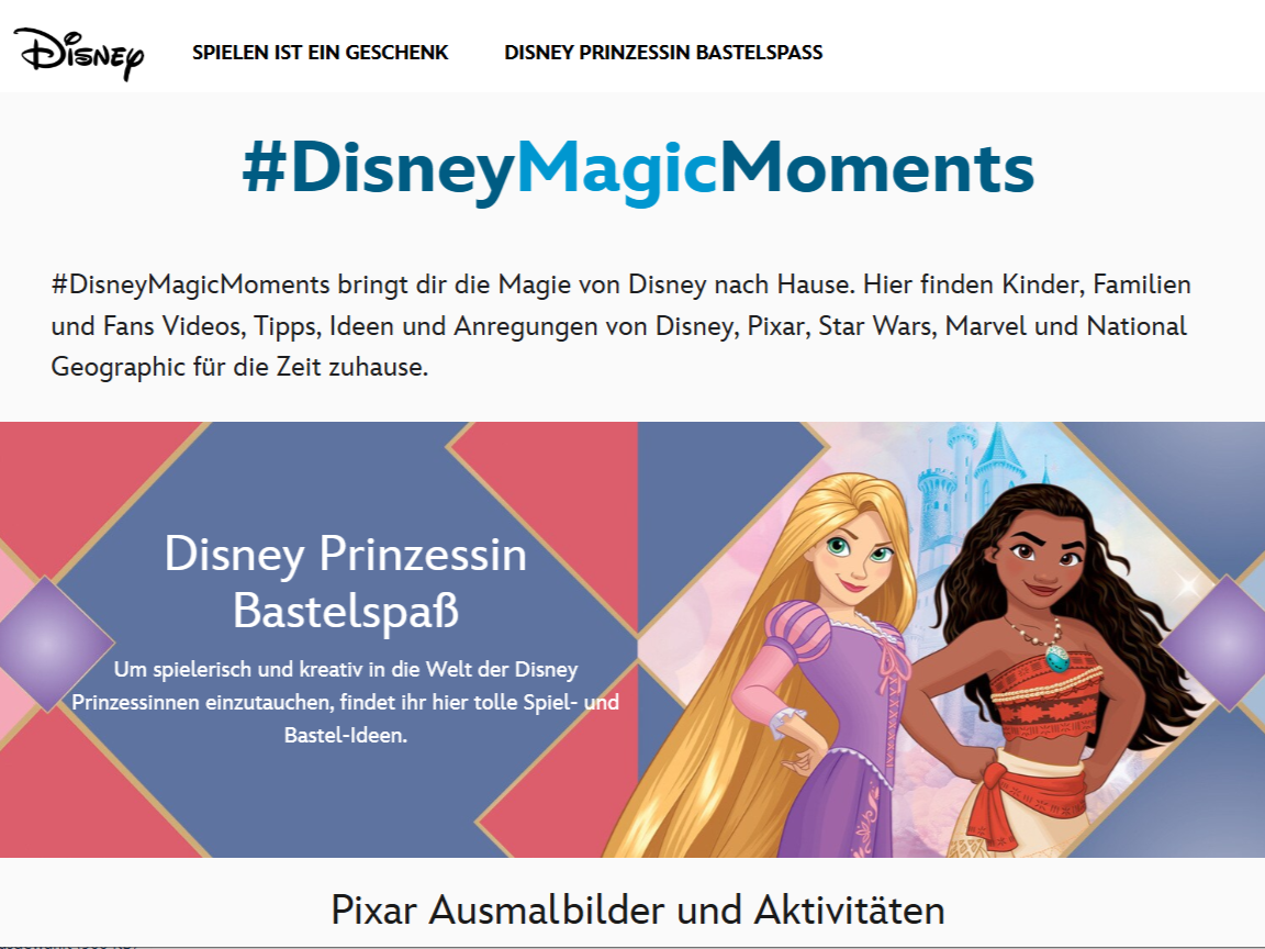 DisneyMagicMoments bringt dir die Magie von Disney nach Hause. Auf dieser Seite findest du Videos, Ideen und Bastelspaß von tollen Filmen und Serien, die du ganz leicht Zuhause anschauen oder nachmachen kannst.