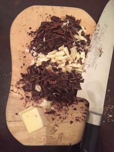 » Kuvertüre Zartbitter (für den Guss) und für extra viel Schokolade: Kuvertüre Vollmilch und weiße Schokolade (für den Teig)