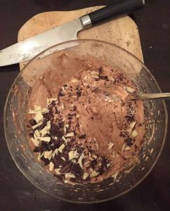 Verrühre die Schokoladenstückchen mit einem Schneebesen oder einem Löffel in den Teig.