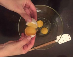 Schnappe dir eine Schüssel und schlage die Eier darin auf.