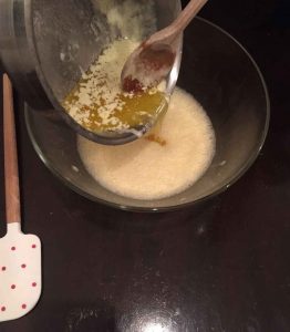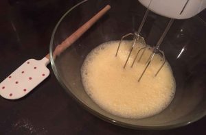 Jetzt kommt der Zucker in die Schüssel. Danach verquirlst du alles mit einem Handrührgerät für mindestens 3 Minuten.