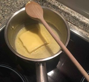 Jetzt musst du die Butter schmelzen. Sei vorsichtig im Umgang mit dem Herd und bitte einen Erwachsenen um Hilfe.