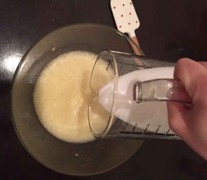 Schütte ein wenig Milch in die Schüssel. Verrühre dann die Zutaten mit einem Handrührgerät zu einem flüssigen Teig.